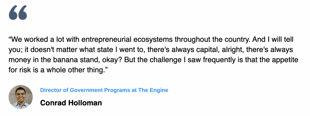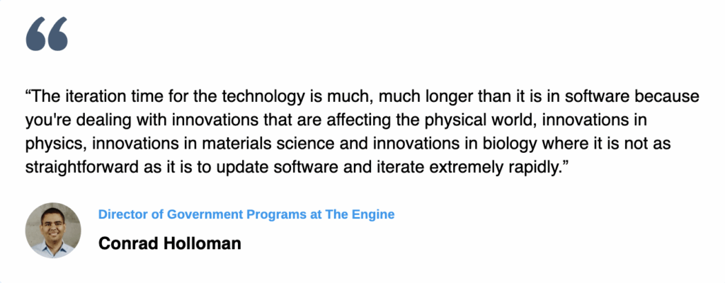 Conrad Holloman – Director of Government Programs at The Engine. Conrad Holloman is a key figure at The Engine, a public benefit corporation spun out of MIT. They focus on commercializing challenging technology ventures in science and engineering. Conrad specializes in forming public-private partnerships and guiding startups through regulated market entry strategies.